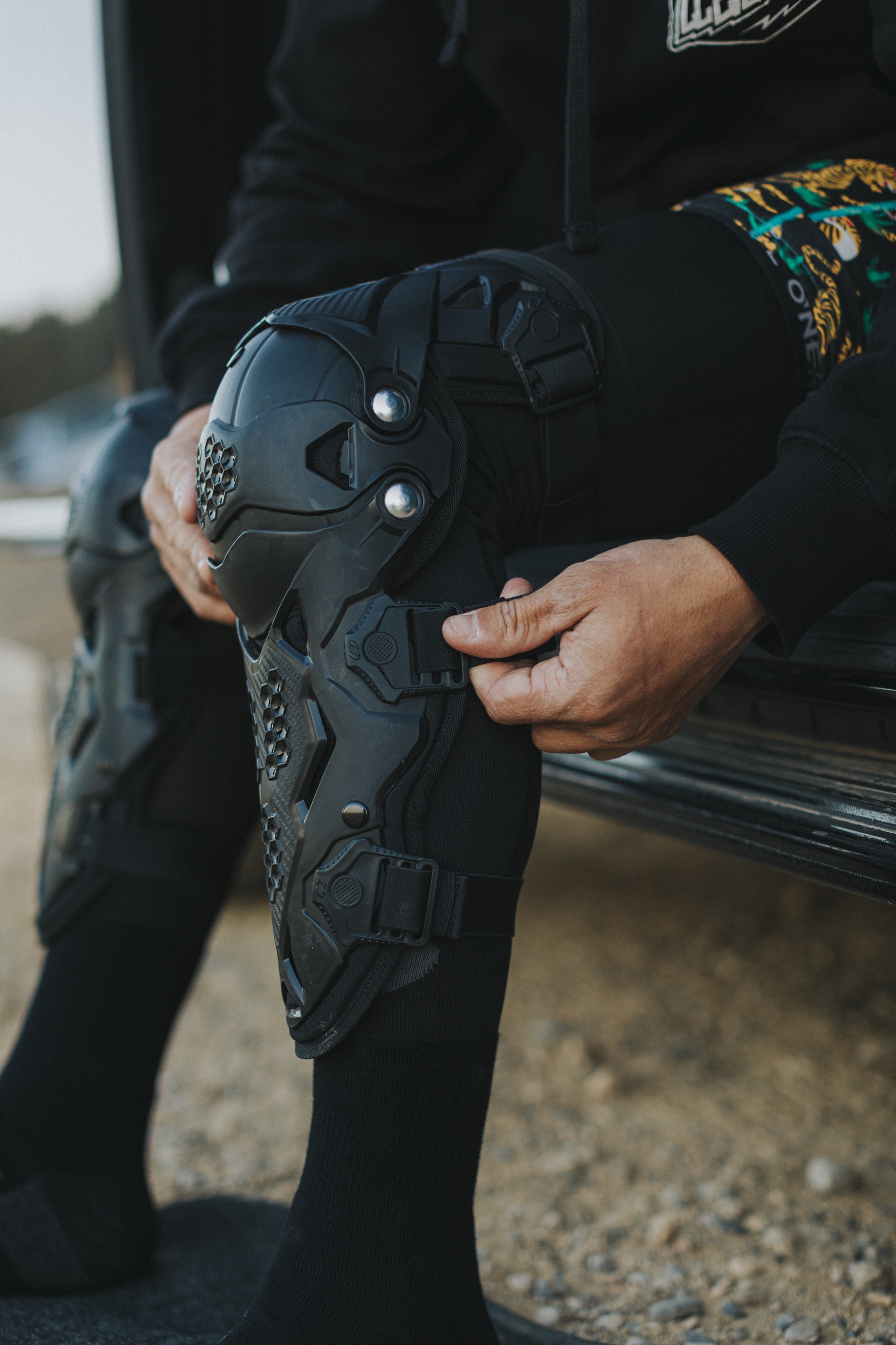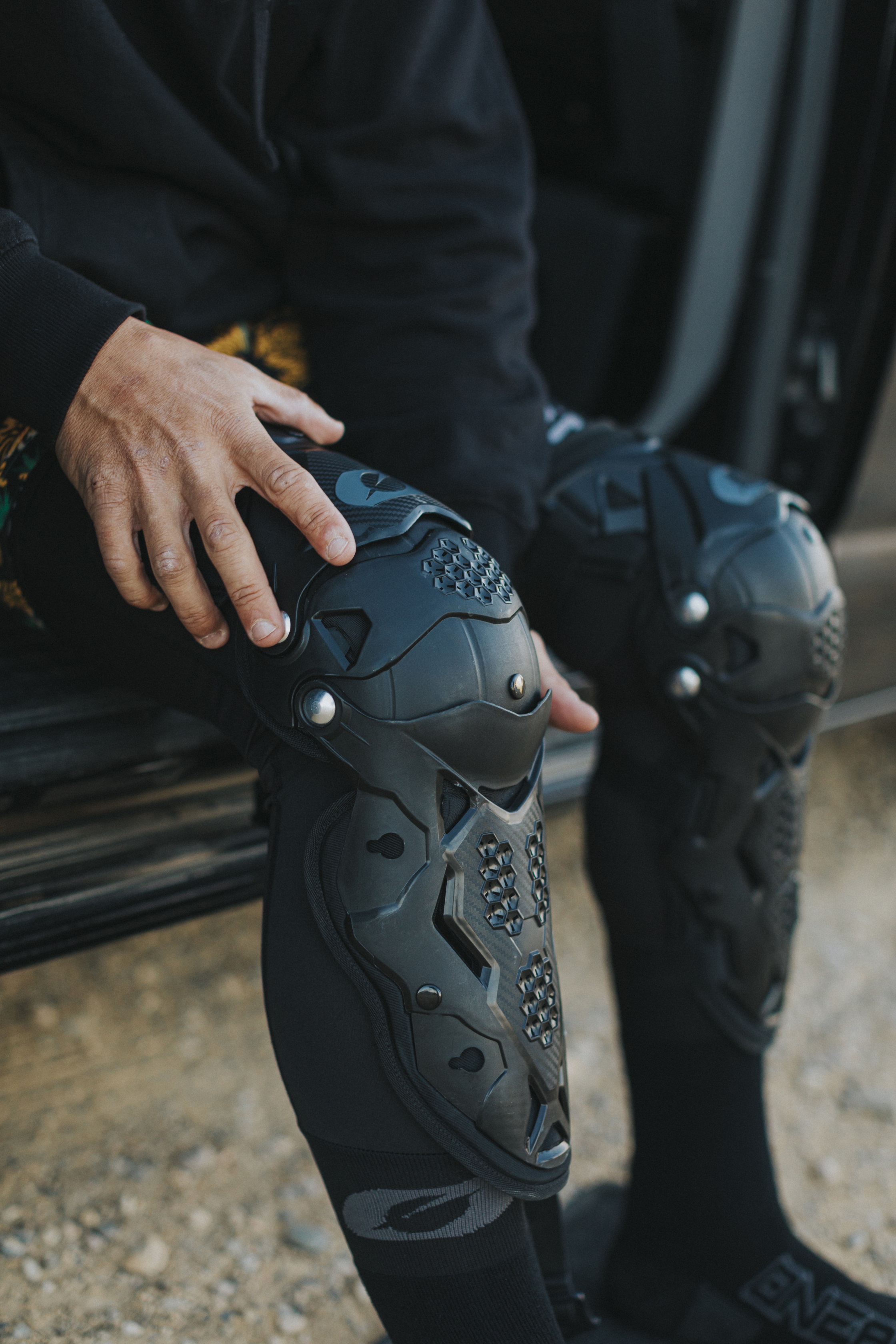 Ассиметричный левый и правый наколенник из твердого пластика, заранее заданной сложной формы, для комфортной и удобной посадки.